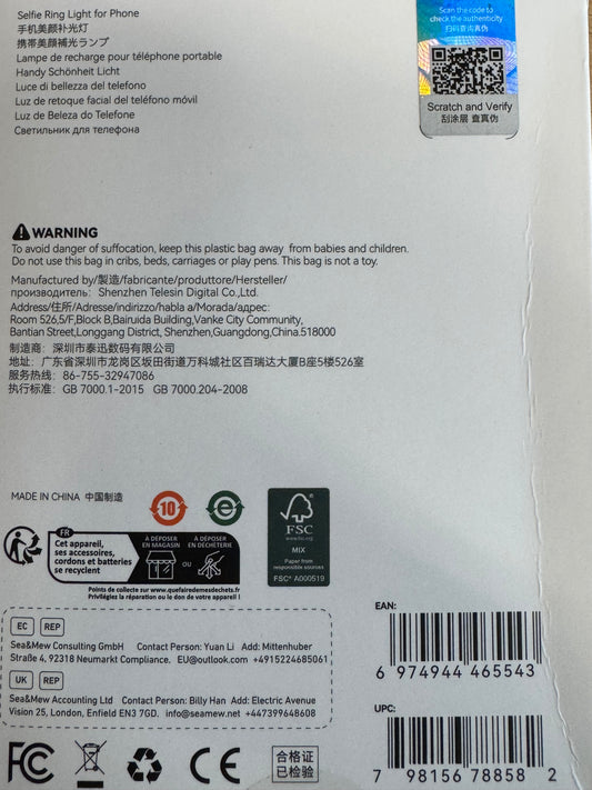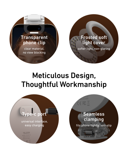 Inside the ring light, there is a small mirror. This allows you to check your framing before taking a photo or video. This is especially useful when using the rear camera of your phone for higher image quality.