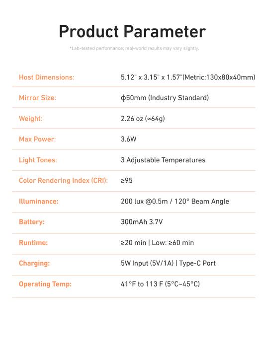 Thanks to its light weight of 64 grams and compact dimensions, you can easily take the selfie light with you anywhere. The built-in 300mAh battery provides a usage time of at least 20 minutes at the highest brightness. You can easily recharge the light for your next use.