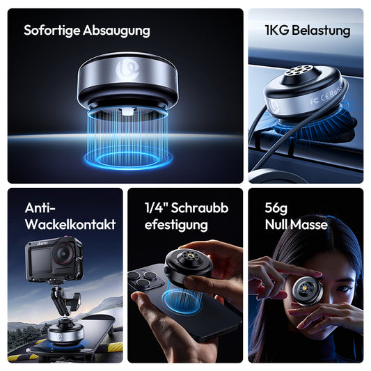 The Ulanzi SK-23 is an electric suction cup base, developed to securely attach accessories such as cameras, lights, or smartphone holders. Thanks to its electric pump and 1/4-inch screw connection, this base offers a stable and reliable attachment on smooth surfaces. Its lightweight and compact design makes it a handy tool for recording in various locations.