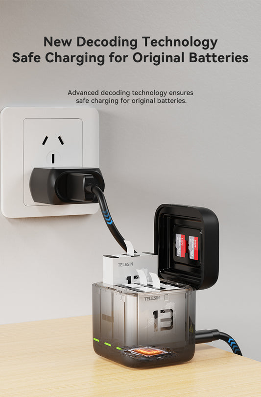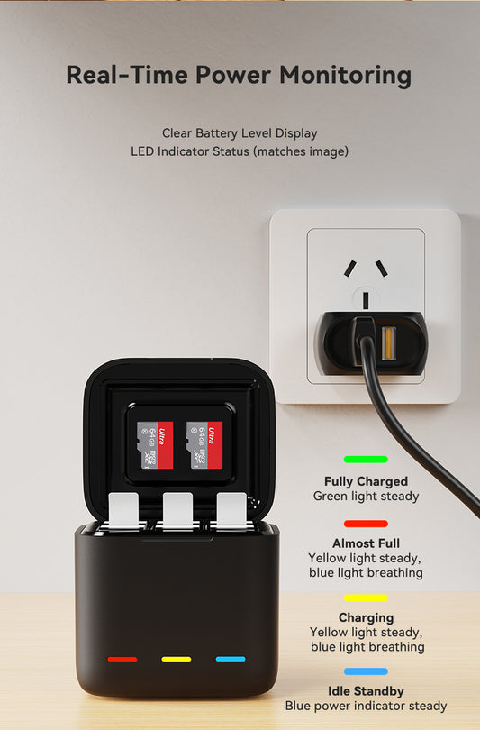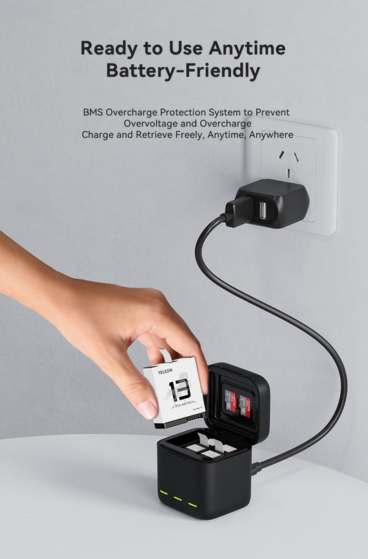The Telesin Charging Box charges three GoPro Hero 13 batteries simultaneously. So you are always ready to capture those important moments, without having to wait for a single battery to charge. This is especially useful during long shooting days or when traveling, where access to power outlets may be limited.
