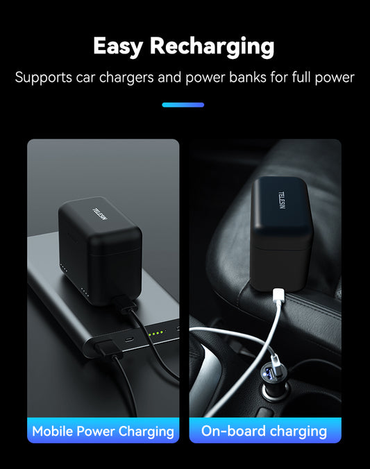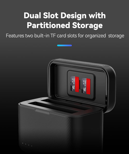 Charge two Insta360 X4 batteries at the same time with the Telesin Charging Box. This compact charger supports fast charging and offers extra storage for your microSD cards, making it a practical accessory for every Insta360 X4 user.