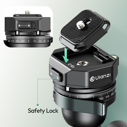 The tripod is equipped with a Uka quick release system on the ball head. This allows you to quickly and securely attach and detach your camera. This saves time when setting up your recording equipment, and the included screws ensure you can get started right away.